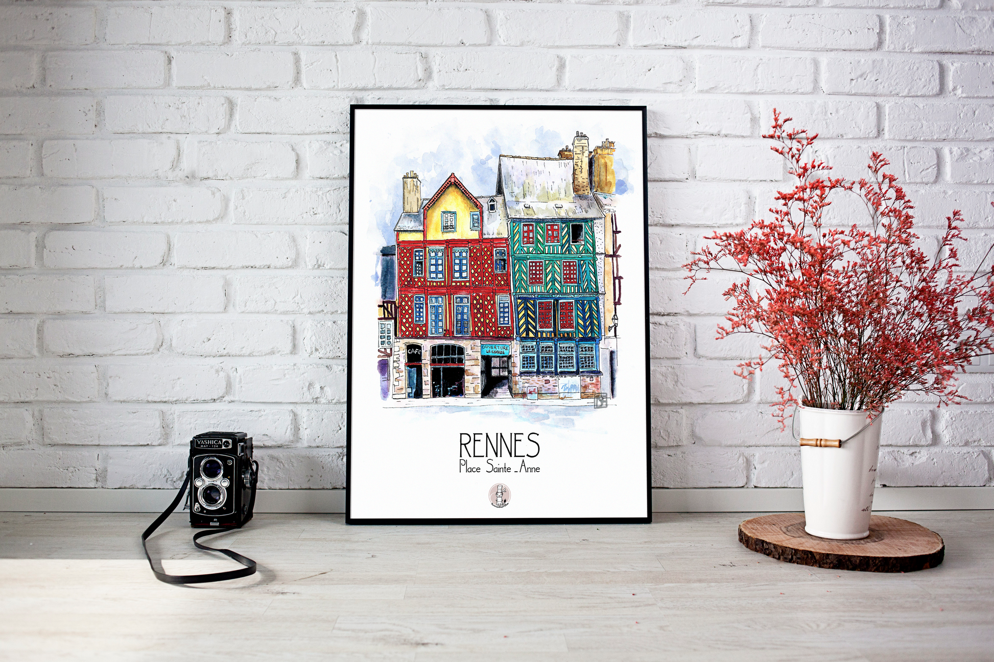 Apportez un bout de Rennes chez vous avec cette illustration colorée et détaillée de la célèbre Place Sainte-Anne. Parfaite pour les amoureux de la ville et des maisons à pans de bois !