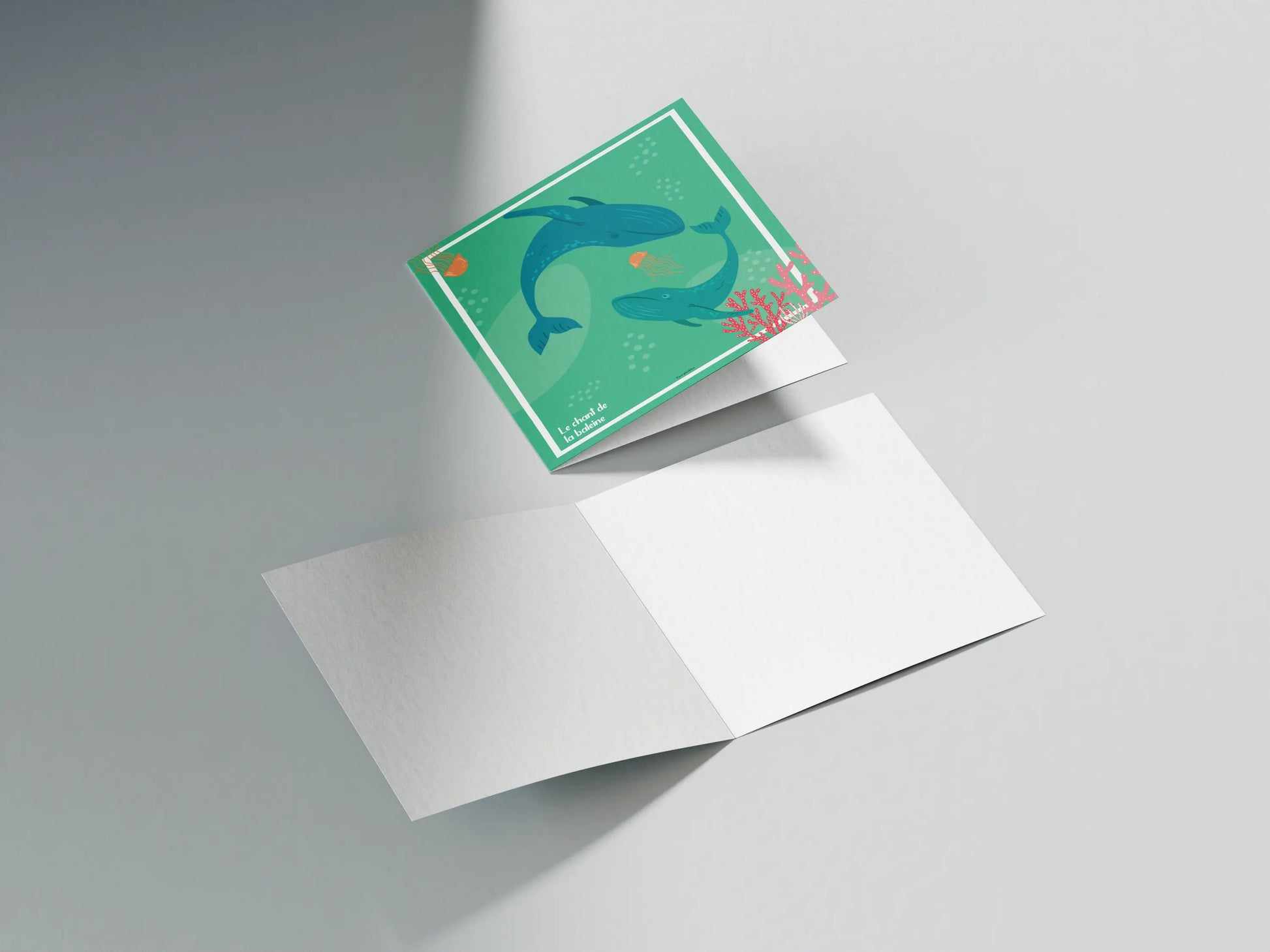 Laissez-vous emporter par la poésie de l’océan avec cette jolie carte mettant en scène deux baleines nageant paisiblement parmi les coraux. Une illustration douce et marine, parfaite pour faire voyager ceux à qui vous l’offrirez.